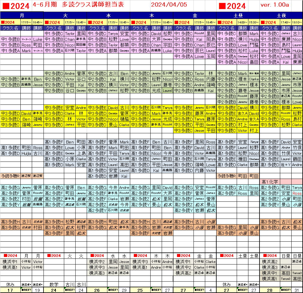 最終クラス分け試験の結果を反映し、一部クラス編成に変更・担当講師の変更がありました。
