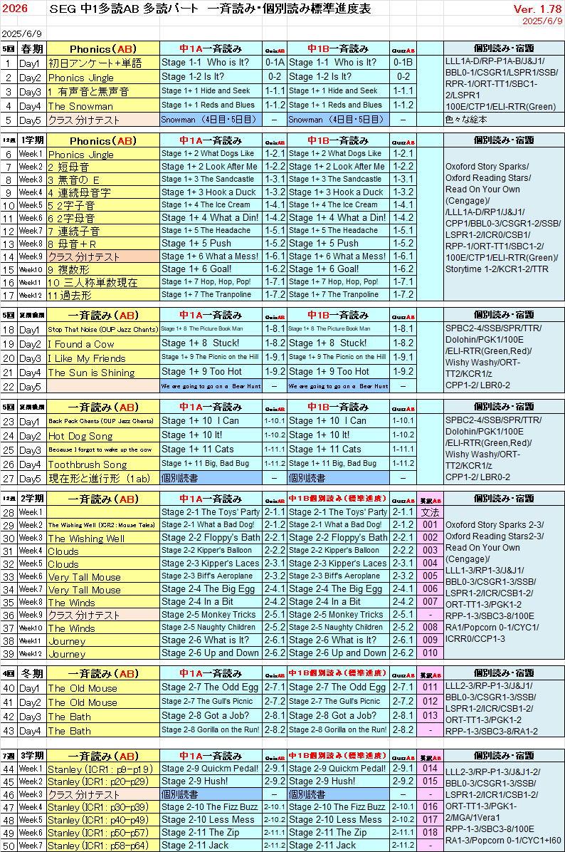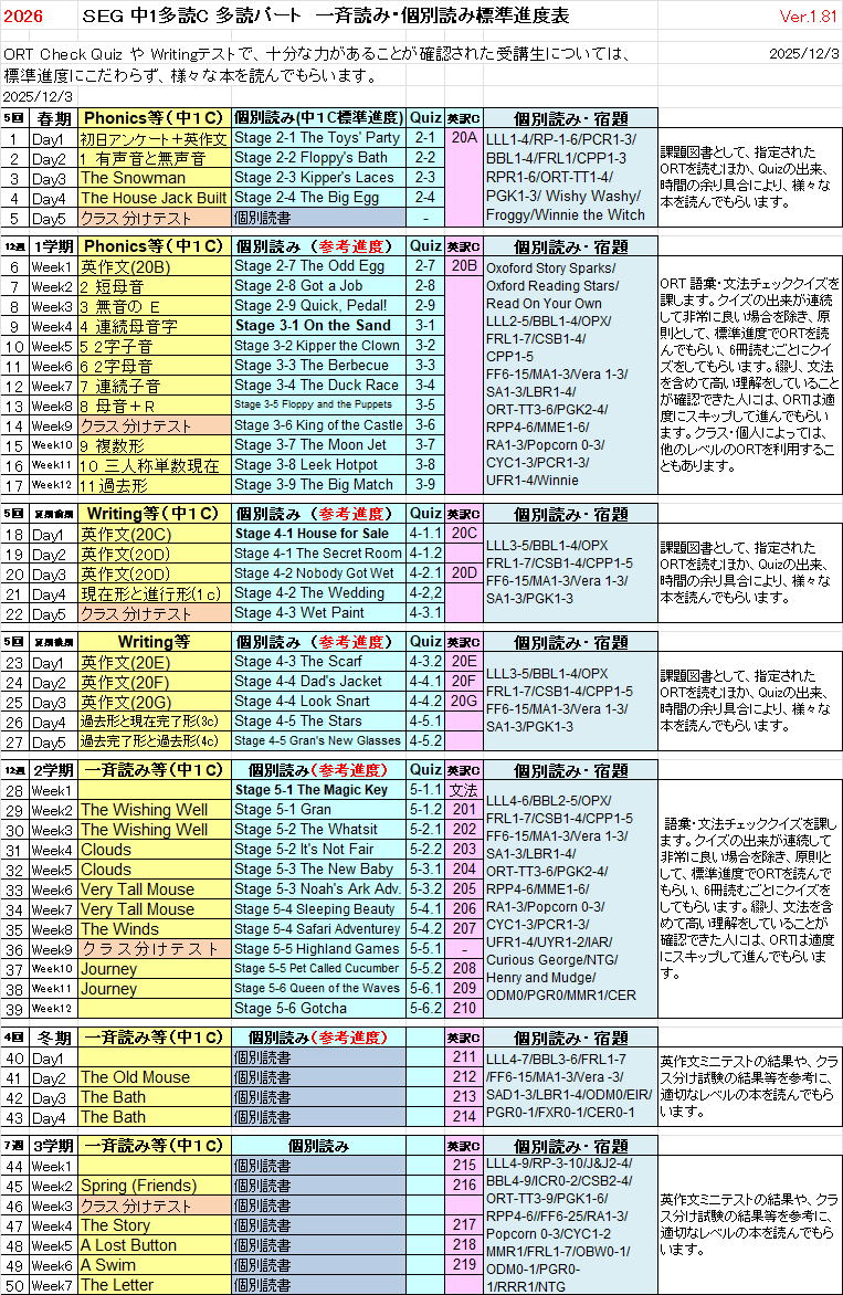中1多読外国人授業パート進度予定表 2025の進度表はこちら 多読パートの進度表はこちら Cクラス B・Aクラス