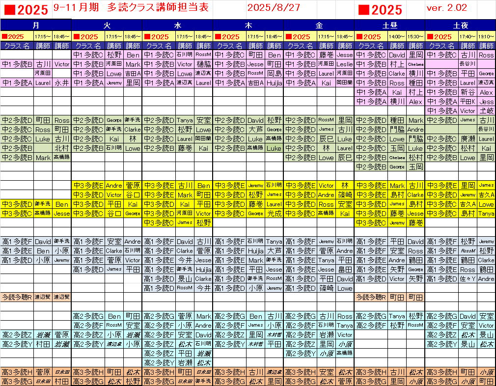 2025年度 9〜11月 英語多読 開講曜日・担当予定講師一覧  2025/8/27