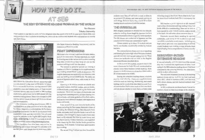 7.1 (May 2014) 号に、東北大学専任講師のBen Shearon先生による、SEGの多読クラス紹介記事が掲載されました。