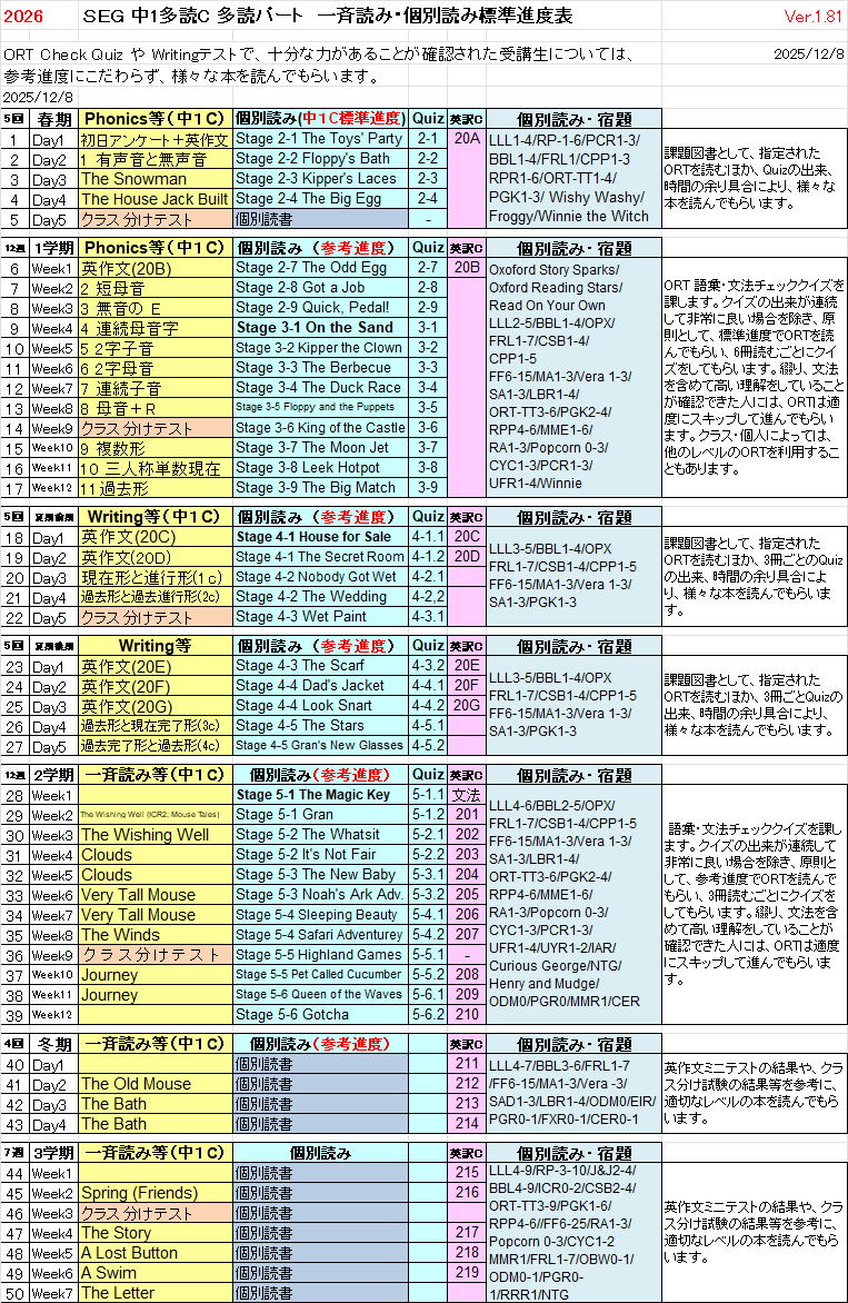 中1多読外国人授業パート進度予定表 2025の進度表はこちら 多読パートの進度表はこちら Cクラス B・Aクラス
