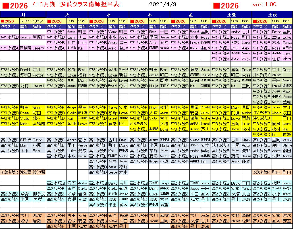 ◆「高2多読」は、平日 5:05-8:25 土昼 1:40-5:00 土夜 5:30-8:50です。 詳しくは、高2多読のページへ