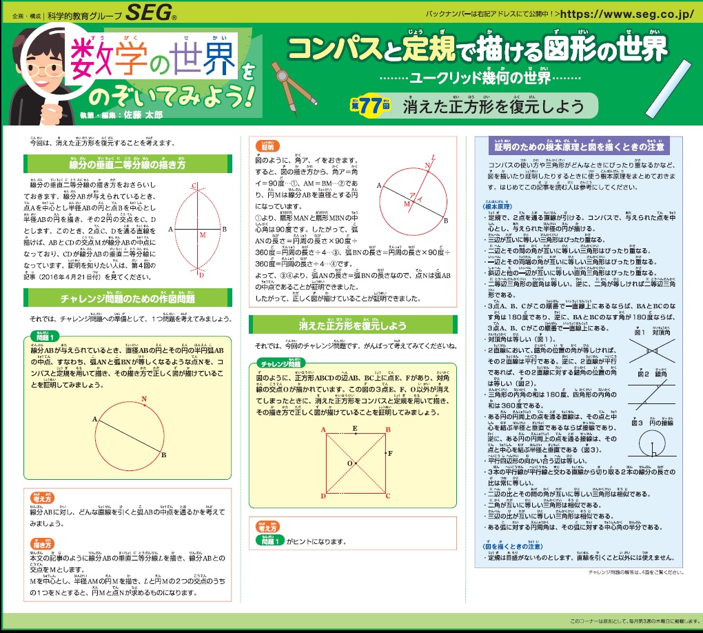 数学の世界をのぞいてみよう!第77回 消えた正方形を復元しよう