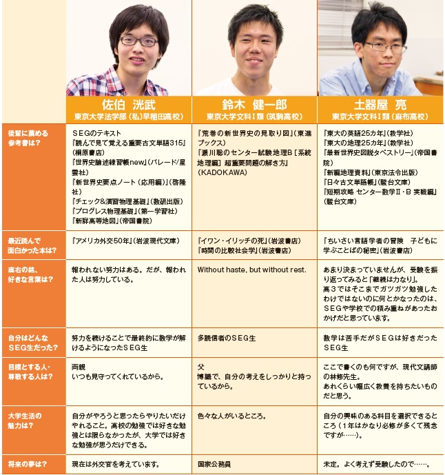 土器屋 東京大学文科Ⅰ類の土器屋亮といいます。出身は麻布高校です。6年間も塾に通うのは嫌だったのですが、英語の本を読むくらいならいいかなと、中1の夏からSEGの英語多読に入り、その後高1で数学も受講するようになりました。