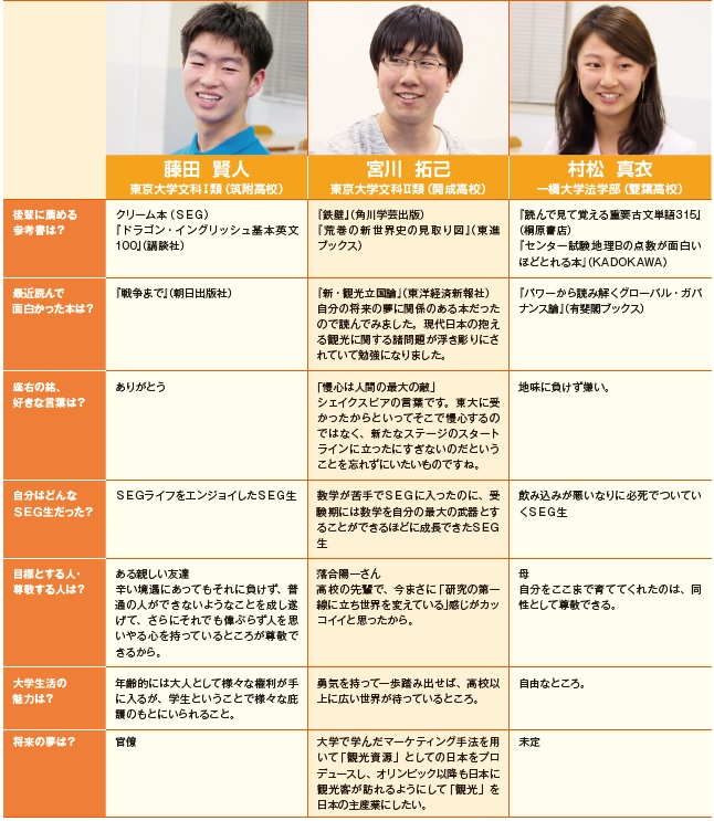 宮川 僕もSEGの英語多読には通っていないのですが、自宅近くの英語教室で高3まで多読を続けました。中3くらいからだんだん長文を読むスピードも上がり、分からない単語の推測精度も上がっていきました。今年は東大英語の出題傾向が変わり、学校の模試では僕よりもはるかに成績の良い人たちが、本番で成績が低迷するなか、僕は95 点という模試でも取ったことのない点数が取れたため、多読は本当に効果があるので、ぜひ勧めたいと思います。