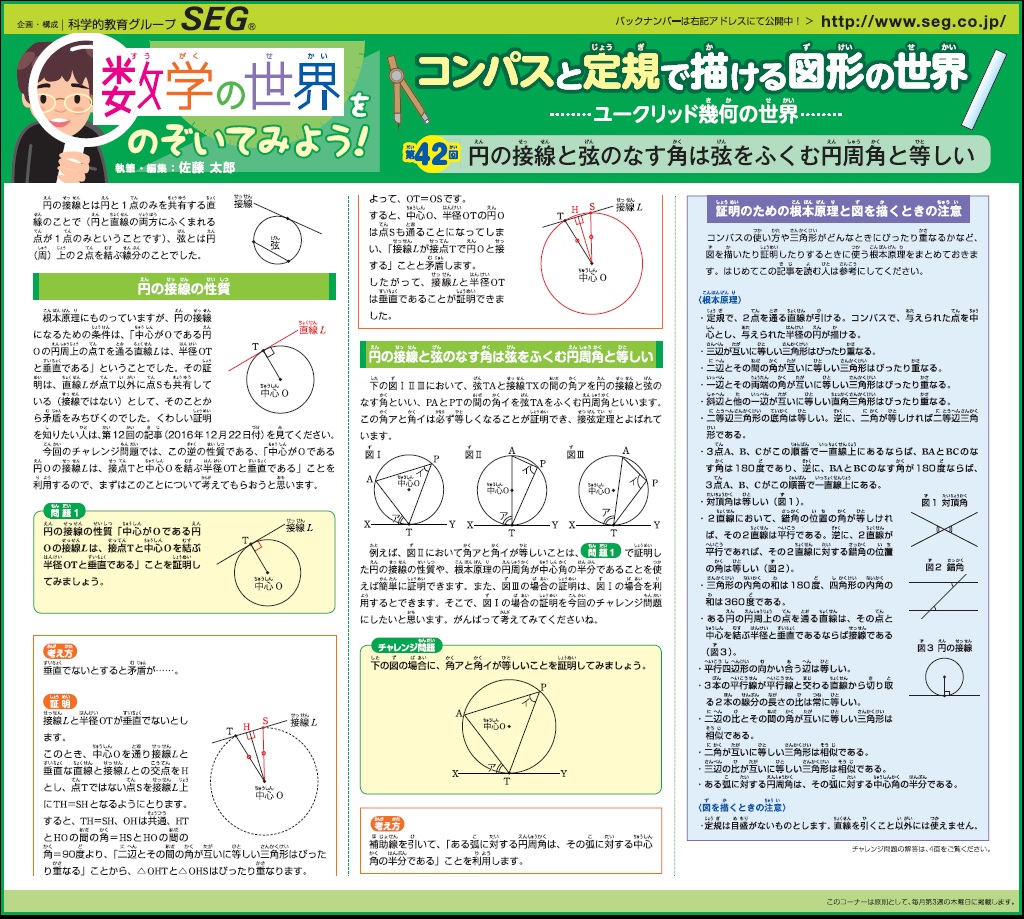 数学の世界をのぞいてみよう!第42回 円の接線と弦のなす角は弦をふくむ円周角と等しい