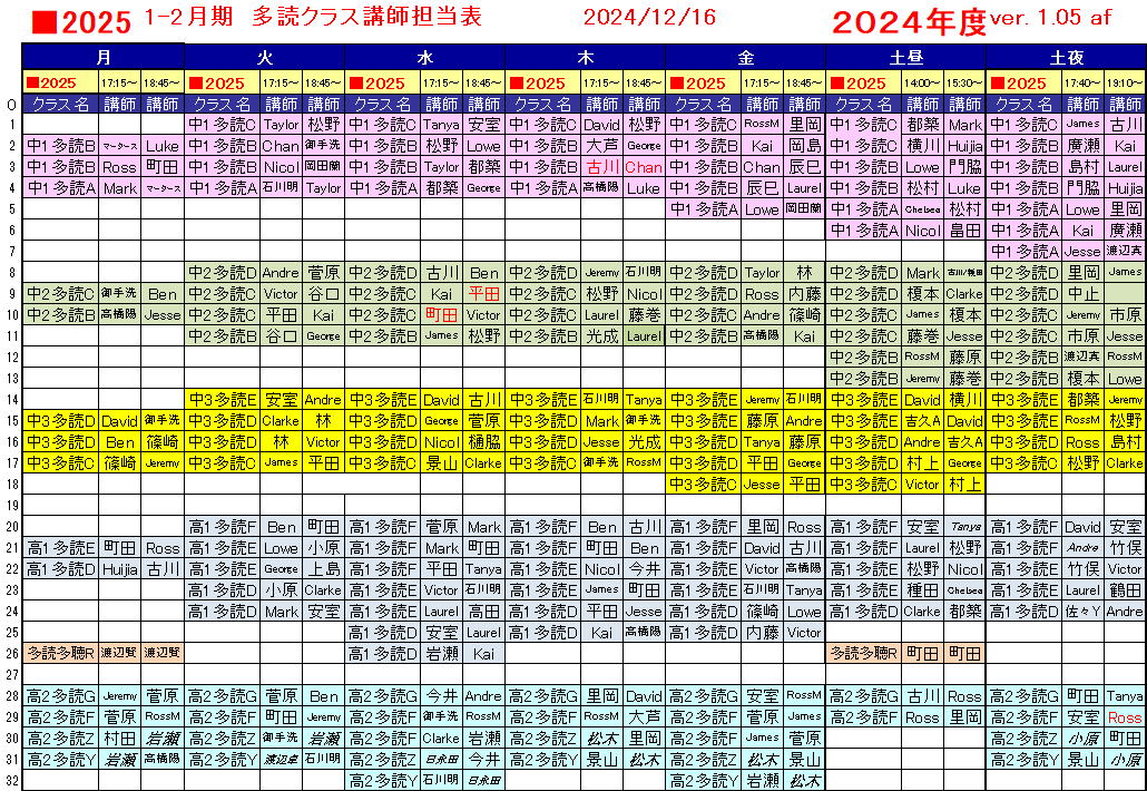 2025年1〜2月 英語多読 開講曜日・担当予定講師一覧  2024/12/16